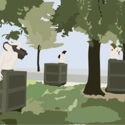 Lámina de ilustración digital de las estatuas de Sirenas, que representan juventud, la madurez y la vejez ubicada en Irún, Gipuzkoa.